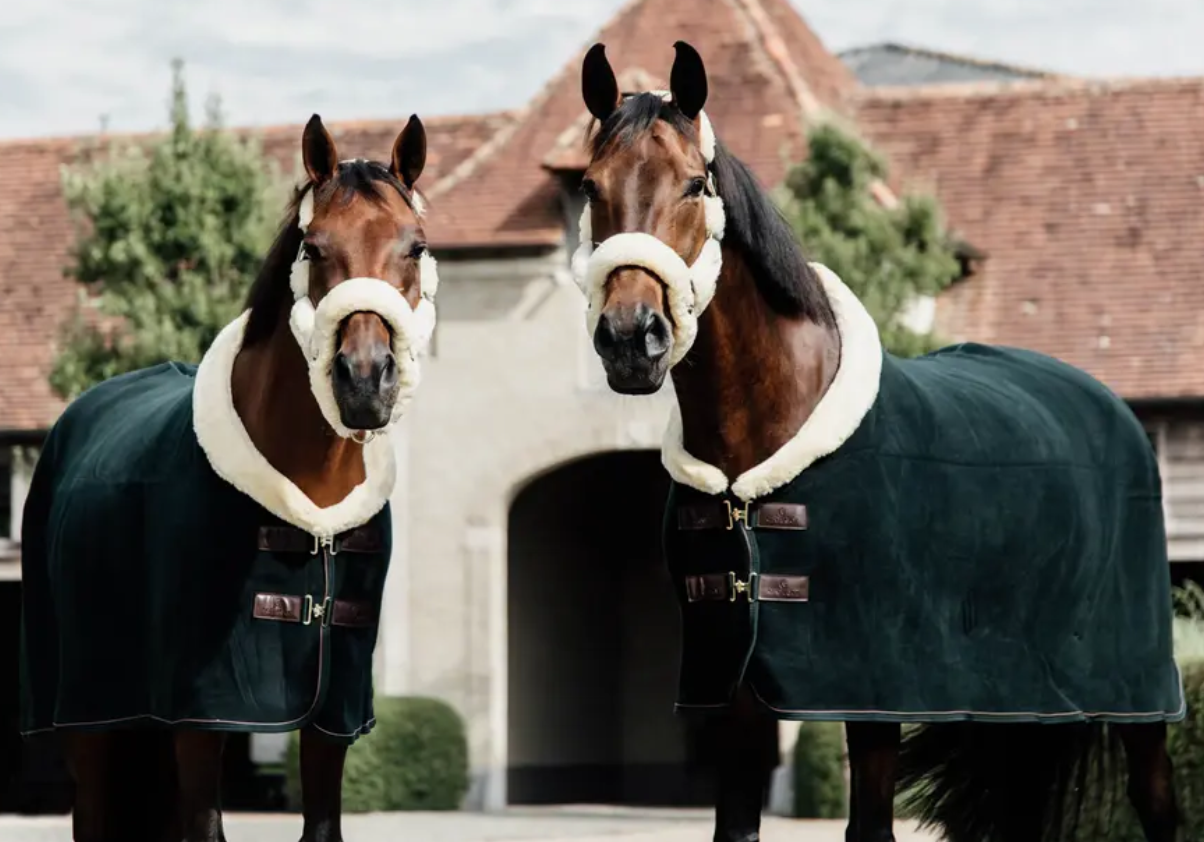 The rug is highly absorbent and quickly wicks away sweat or water. The entire neck and chest are covered with vegan sheepskin, which not only provides warmth but also adds comfort. The rug is finished with vegan leather piping and elegant front closures.