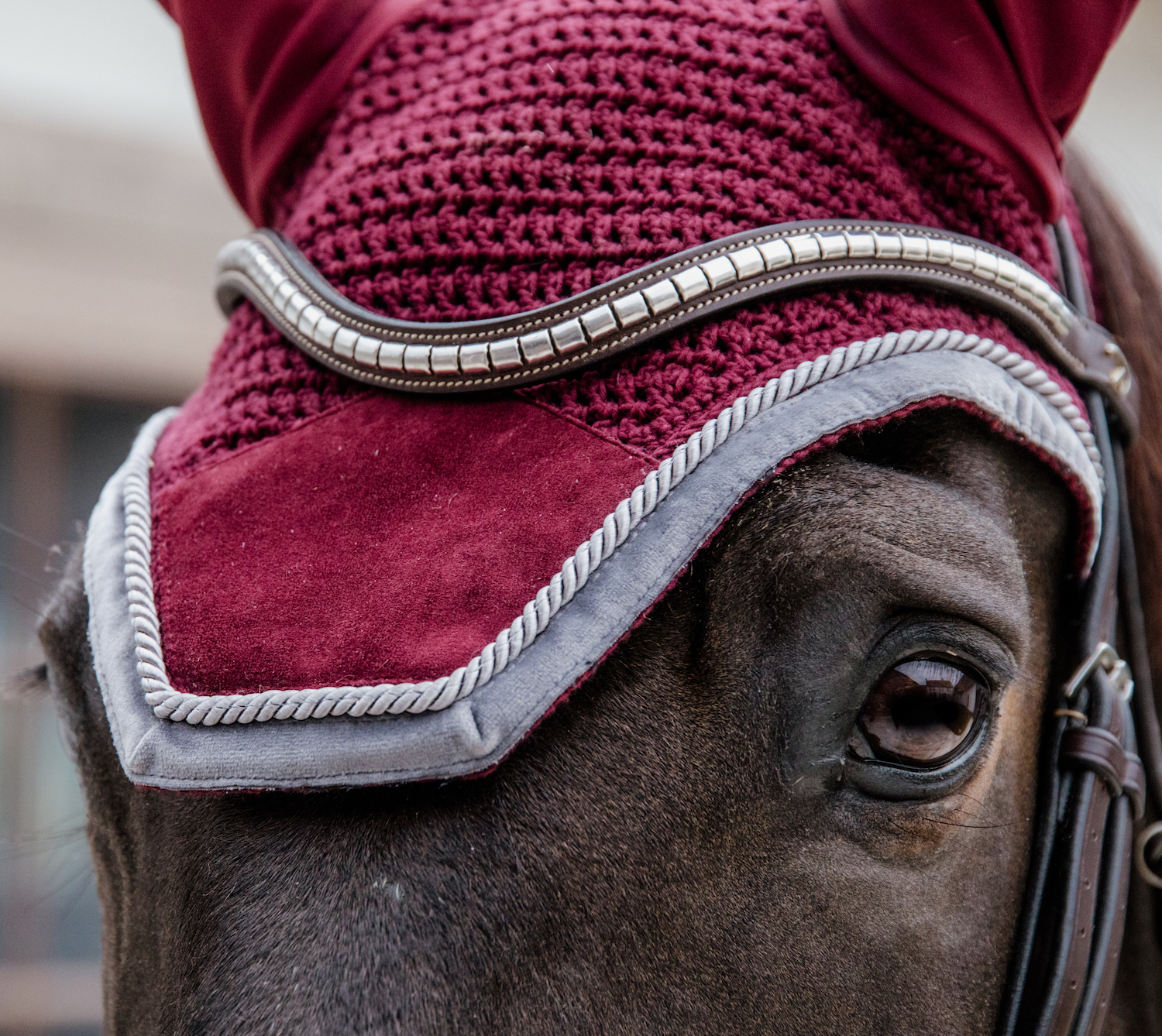 Our Fly Veil velvet contrast is a combination of the modern American look and Kentucky Horsewear’s expertise. This fly veil is hand knitted for better durability, finished with fancy velvet details. The Fly Veil velvet contrast protects the horse’s ears against flies while riding. The material around the ears is stretch and slim fit. The neck part is longer so it can’t slip. The Fly Veil velvet contrast does not have a visible logo; therefore rider or sponsors can embroider their own logo. Hand washing only.
