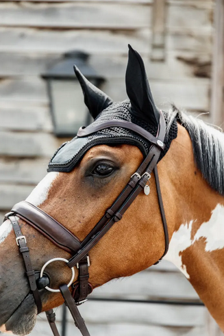 The fly veil is shaped in the modern wellington shape. The neck part is extended so it doesn’t slip under the bridle. There’s no logo on the front, so it can easily be embroidered.