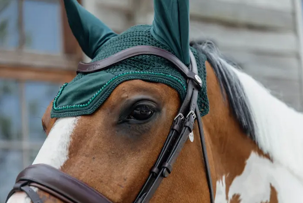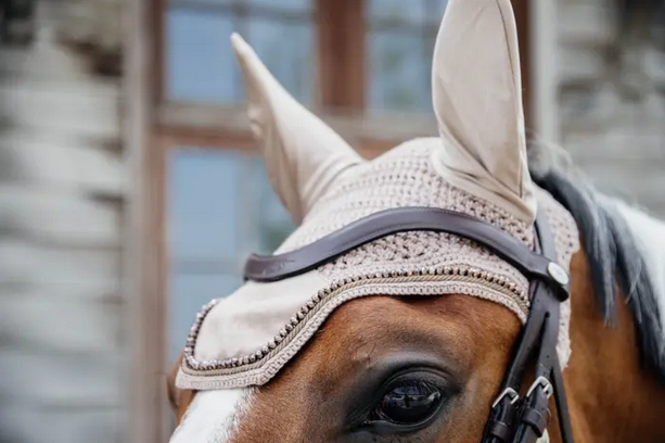 The fly veil velvet pearls is a real eye-catcher, and protects the ears of the horse in the meantime. The fly veil matches the velvet pearls saddle pad and bandages.