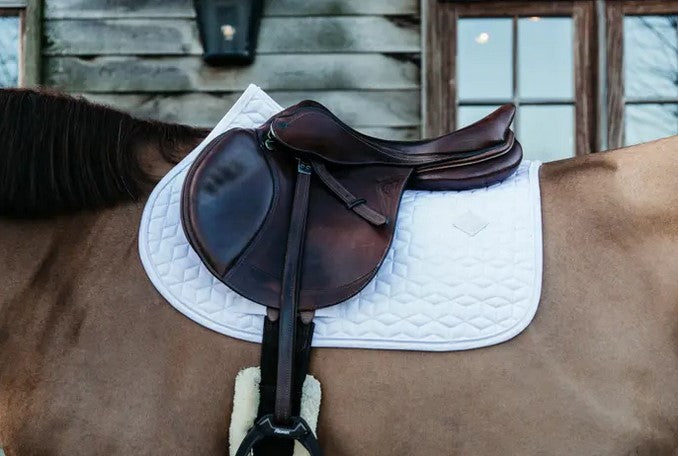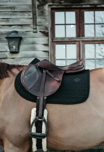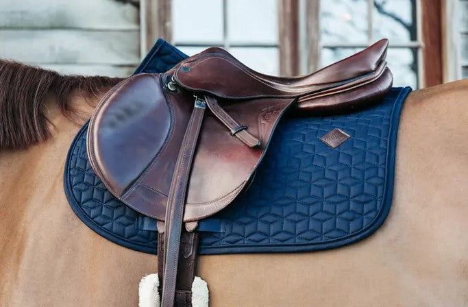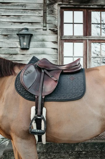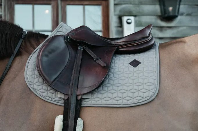 The outside of the saddle pad is made from a cotton-like polyester in a chic cube quilting design. On the left side of the saddle pad is a small vegan leather patch with the Kentucky logo, under the logo there’s enough space for embroidery. The lining of the saddle pad is a moisture-wicking cotton-polyester mix.