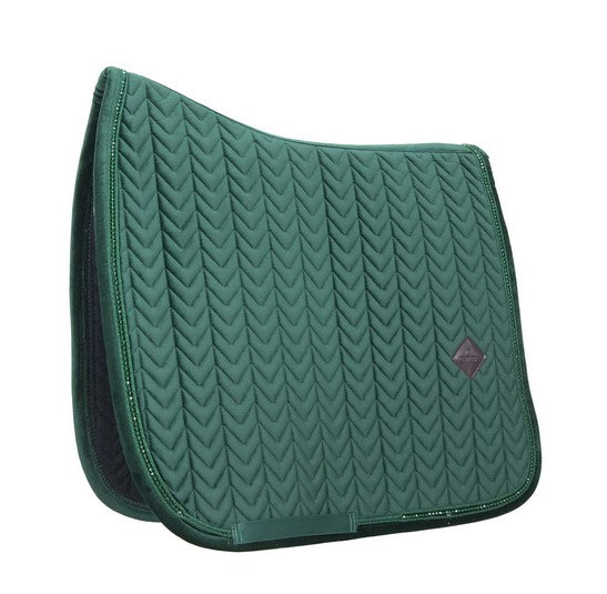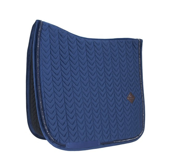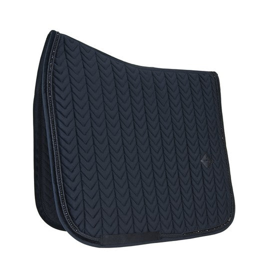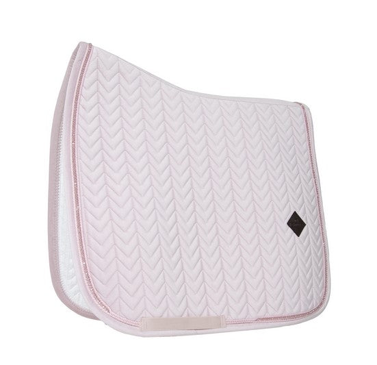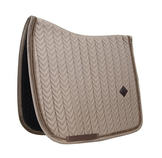 The outside of the saddle pad is made from our famous and soft velvet fabric in fishbone quilting. The piping is finished off with chic pearls. The lining of the saddle pad is a cotton and polyester mix which easily absorbs sweat and is very breathable.