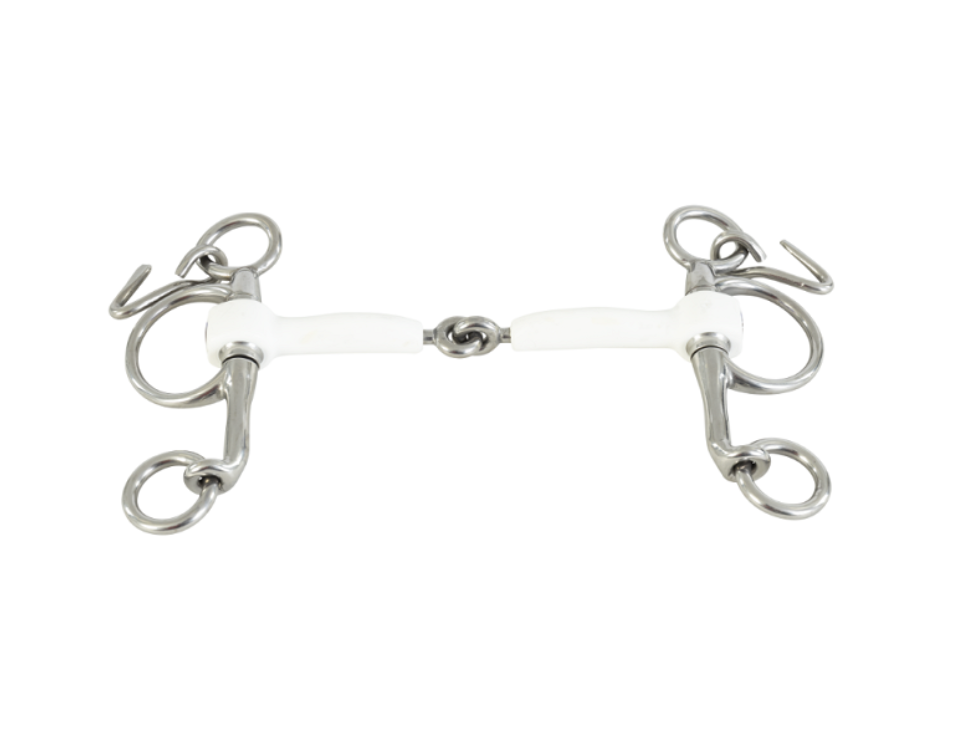 The pelham cheekpiece combines the action of a snaffle and a bar and loose ring The bit has one jaw piece but can be ridden with one or two reins. If you choose to ride with one rein, a pelham strap is needed to connect the bit rings to the rings of the scissors. The pelham is a leveraged mouthpiece. The longer the scissors, the sharper the effect. The baby pelham has short bars and therefore has a milder effect than the normal pelham. A pelham bit is mainly used for strong horses, horses with too little space in the mouth for two mouthpieces or horses that have to get used to a bar and snaffle. This bit is not suitable for the inexperienced rider.