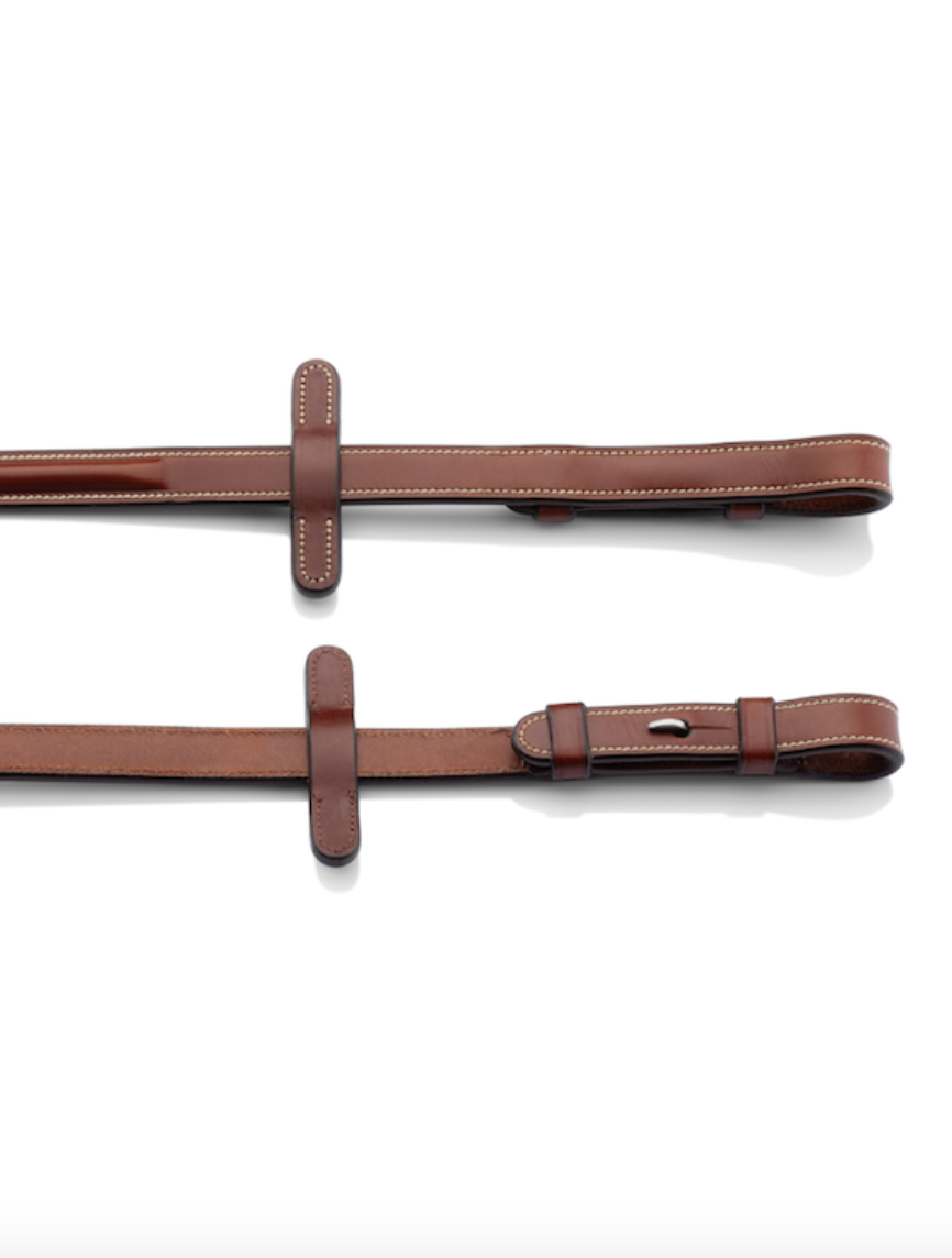 These Italian leather reins feature steel fittings and flexible pimpled rubber grip. The reins match the bridle called Deauville