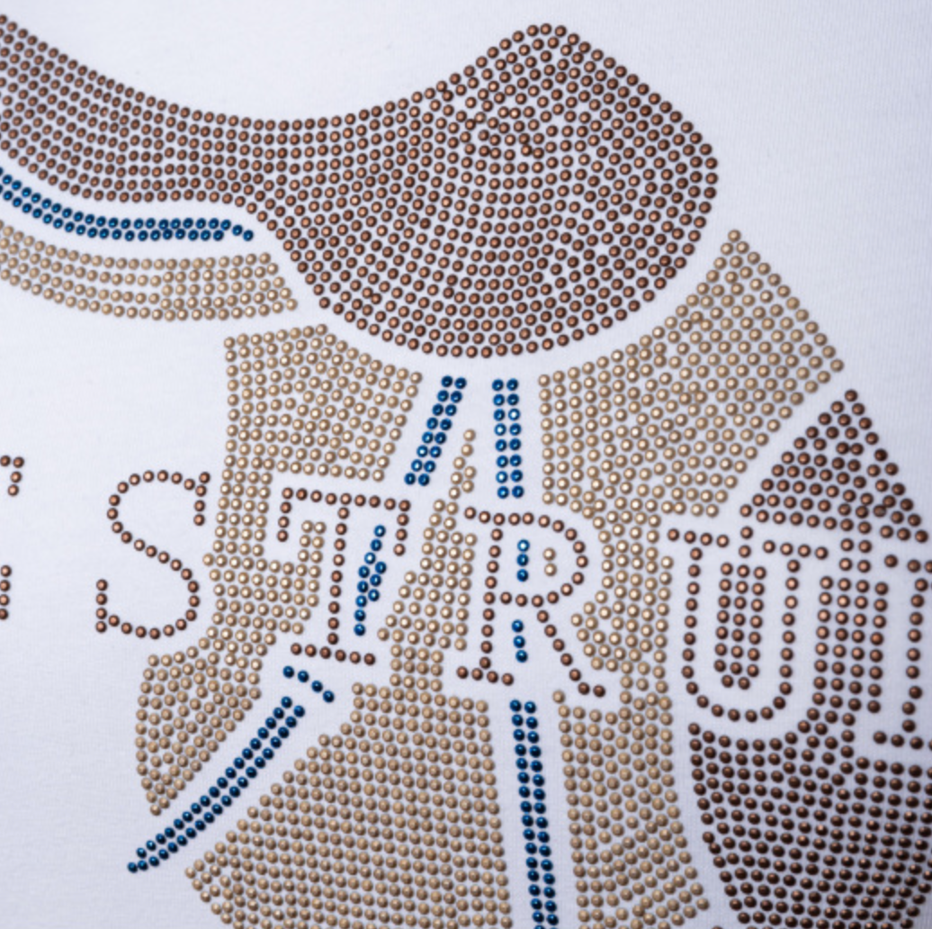 The eye-catching front print features a saddle emblem in white, beige, blue and turquoise metallic studs, adorned with Vestrum lettering for a contemporary stylish look.